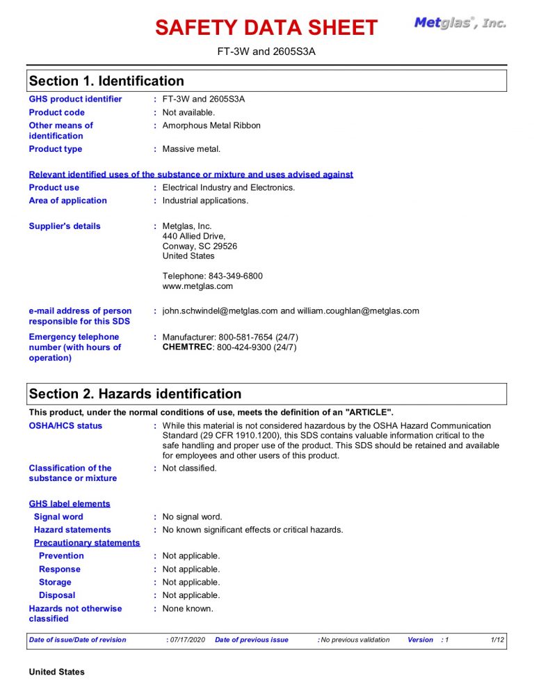 - 6.) SDS for Metglas FT-3W and 2605S3A
