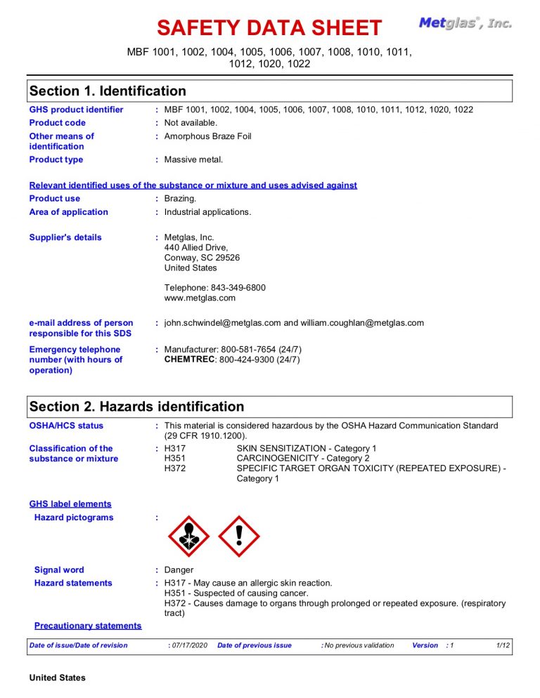 - 2.) SDS for Metglas Brazing Foil MBF 60, 62, 64, 67, 601 and 602