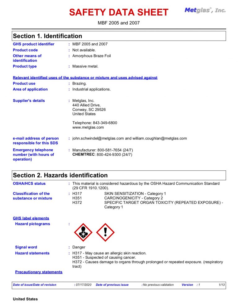 - 1.) SDS for Metglas Brazing Foil MBF15, 20, 23, 30, 50, 51, 53 and 80