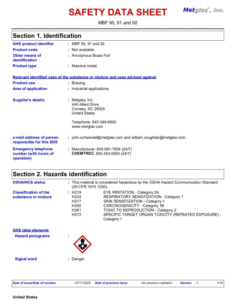 - 3.) SDS for Metglas Brazing Foil MBF 90, MBF 91 and MBF 92